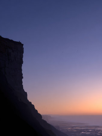 Silhouettes of cliffs and the sea are visible against a pastel sky at sunset with dark shapes marking the landscape.