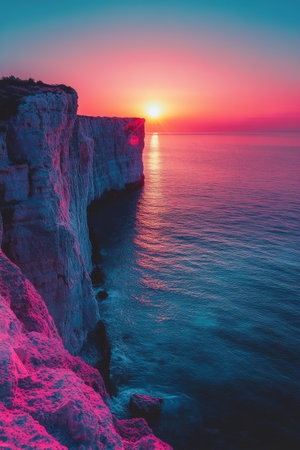 AI Generated. Vibrant Sunset Over a Turquoise Sea Through Coastal Cliffs