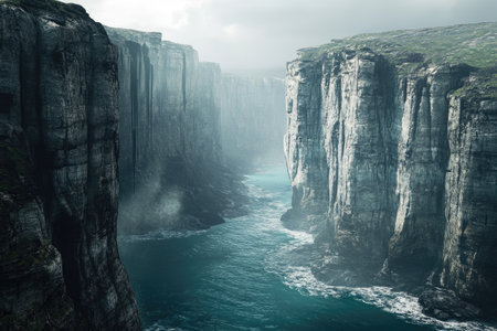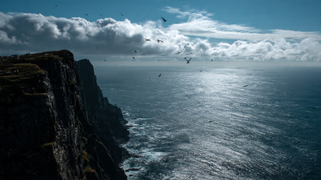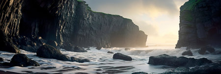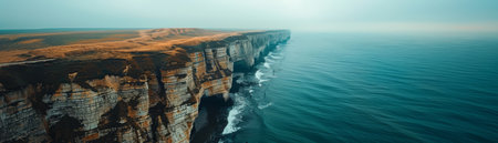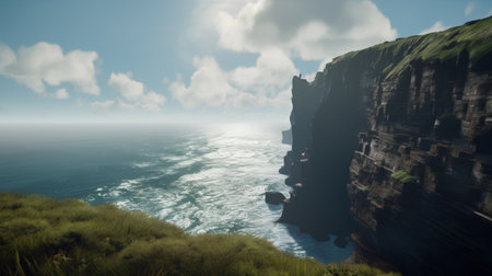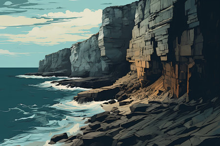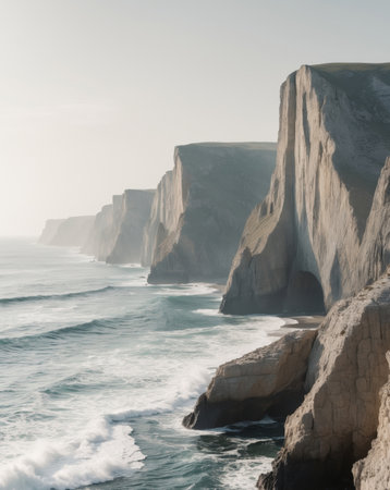 the awe-inspiring beauty of coastal cliffs, as they stand tall and rugged against the crashing waves below. towering cliffs and the power of the ocean, creates a sense of awe and wonder