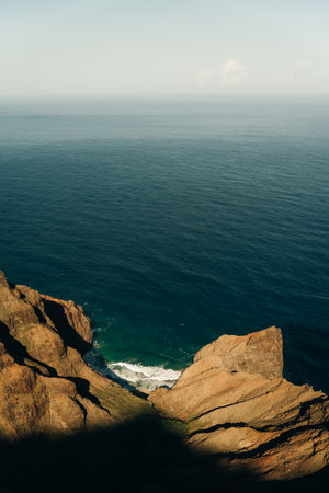 A majestic capture suited for travel brochures, environmental studies, or artwork collections | The photo presents an awe-inspiring display of nature's splendor with its panoramic view of towering cliffs steeply descending into the tempestuous blue sea. The relentless waves crash against the solid rocks, sending white sprays of sea mist into the air, evoking the raw power and perpetual motion of the ocean. The lighthouse stands resolved on a detached craggy rock, a testament to human ingenuity in the face of natural forces. Its presence conveys safety and guidance amidst the untamed marine landscape. The cliffs, tinged with hues of brown and ochre, offer a stark contrast against the deep blue of the ocean, highlighting the diverse color palette of the coast. The sunlight washes over the scene, casting warm tones and creating nuanced shadows that give a three-dimensional quality to the cliffs. This image encapsulates the juxtaposition of tranquility and intensity that coastal landscapes provide | Perfect for environmental campaigns that emphasize the beauty and majesty of untouched natural scenes, as inspiration in creative arts, or as part of a visual story in travel and adventure editorial content. The grandeur captured here makes a compelling backdrop for motivational themes or could be used by travel agencies to attract tourists seeking natural wonders | a wide-angle landscape shot emphasizing the contrasting textures of rugged cliffs and swirling ocean waters, under sunlight that enhances the intricate details of the scene, leaving space for copy and visual additions