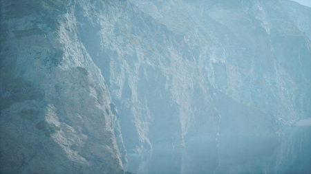 Majestic cliffs rise along the coastline, shrouded in mist. The tranquil atmosphere creates a feeling of peace as waves gently lap at the shore.