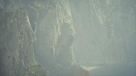 AI Generated. Northern Coastline from Sandy Cliff in Foggy Morning