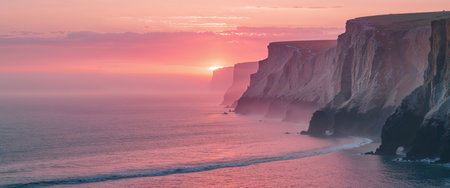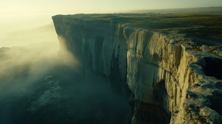A mesmerizing view of a coastal cliff edge at sunrise, surrounded by ethereal mist and soft fog, creating a breathtaking atmosphere of tranquility and beauty.