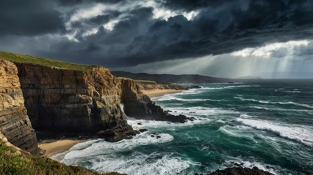 A dramatic coastal scene features dark, stormy clouds above a rocky coastline, with shafts of sunlight piercing through. The rough sea crashes against the cliffs, showcasing the power and beauty of nature.