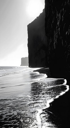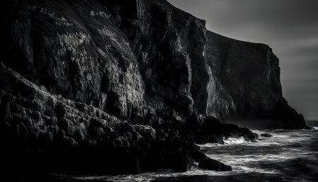 A dramatic black and white photograph captures the raw beauty of coastal cliffs meeting a vast, dark ocean. This striking seascape presents a monochrome vision of nature, with towering cliffs and textured rocks contrasting against the water. The moody atmosphere, amplified by deep shadows and stark contrast, evokes a sense of both serenity and drama. Ideal for evoking a sense of minimalist design, zen contemplation, or for use in projects related to earth science, geology, or abstract art.