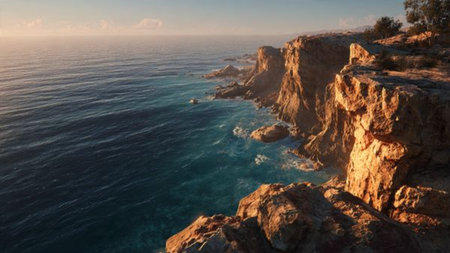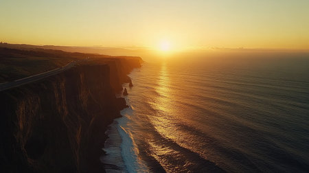 Experience a breathtaking sunset over rugged coastal cliffs, where the golden hour casts a warm glow on the ocean waves, creating a serene landscape.