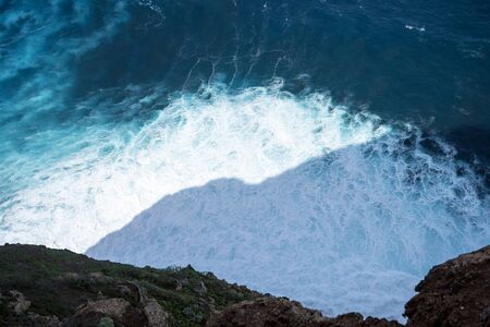 White showing steep coastal cliffs overlooking a deep blue ocean with crashing white waves. resolution use.