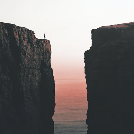Person stands poised on the edge of a steep cliff, overlooking a tranquil body of water nestled between two imposing, dark cliffs. A soft, pinkish-red hue bathes the sky and water, creating a tranquil and evocative scene.