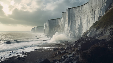 ocean waves crash against majestic cliffs in this stunning photograph, capturing the essence of traditional british landscapes. with a touch of matte painting, this national geographic-worthy image showcases atmospheric urbanscapes. shot with a hasselblad h6d-400c, the hyperrealistic landscape is a captivating blend of dark, white, and silver tones. ai generated