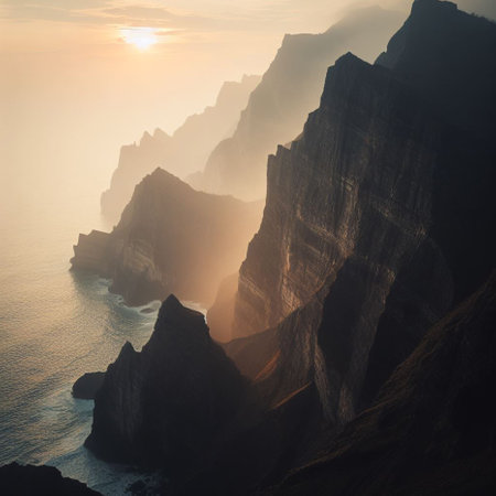 Towering cliffs loom over calm waters, shrouded in mist and bathed in golden light. The scene captures the quiet beauty of nature at dusk, evoking a sense of peace and wonder.