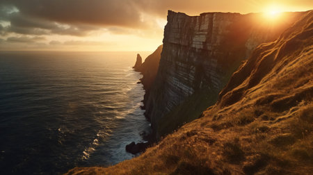 AI Generated. Stunning sunset over rugged coastal cliffs and ocean horizon
