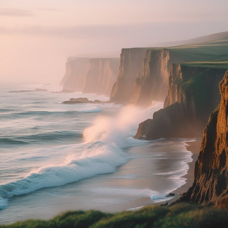 This stunning coastal scene captures the soft glow of a sunset illuminating rugged cliffs and gentle waves, offering a tranquil escape into nature's beauty.