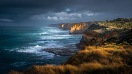 Cliffs Ocean Sunlight Golden sunlight illuminating dramatic coastal cliffs overlooking vast ocean expanse