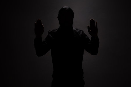 Silhouette of man in the hood or hooligan over dark background with copy space