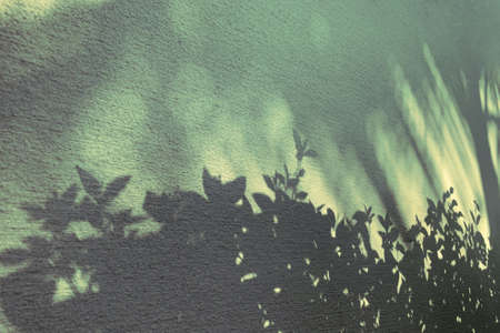 Abstract light and shadow blurred bacground, flower plant bush and palm leaves tree shadows on concrete wall in green color tone.