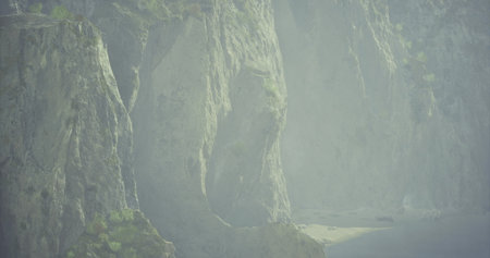Cliffs Coast Ocean Rocky Green Hills Coastline with Crashing Waves in Misty Weather