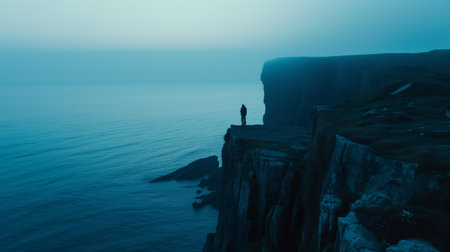 An AI generated illustration of a solitary figure standing at the edge of a cliff overlooking the sea at dawn