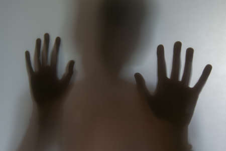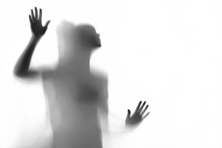 Blurred silhouette of a man with a naked torso behind a frosted curtain or glass. The man touches the transparent curtain with his hand. Ghost concept.
