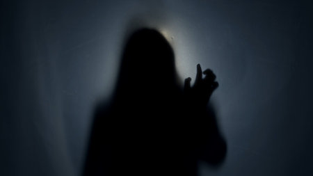 A dark silhouette of a woman behind a mat curtain, illuminated by a beam of light. The woman touches the curtain. The afterlife, the otherworld.