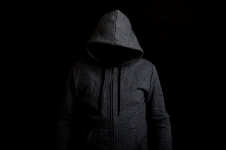 Criminal person with hoodie and unrecognizable face. Conceptual crime and violence low key image with copy space.
