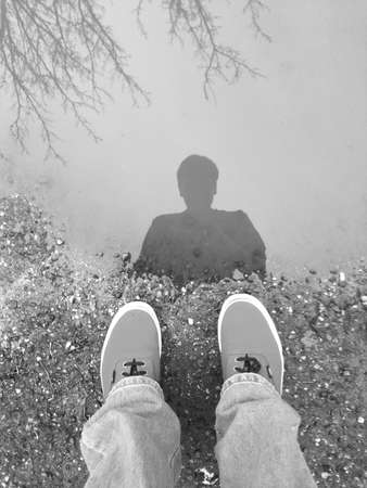 reflection of person in puddle. puddle outside. Person stands on wet road. Feet on asphalt.
