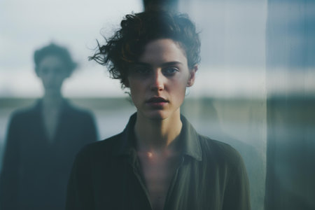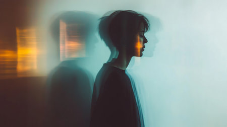 A captivating figure stands in front of a mirror, creating a striking reflection. The blurred silhouette conveys emotion and depth, inviting introspection.