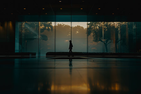 High-tech building interior with glass walls, polished floors, walking silhouette, soft light, minimalist design.