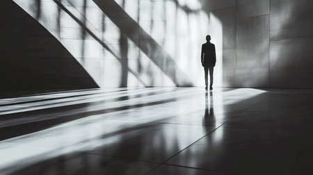 A solitary figure stands in a spacious architectural interior, where dramatic shadows intersect with soft light. The minimalist design accentuates themes of solitude, emotion, and the beauty of light and shadow interplay, creating a visually striking moment of quiet reflection.