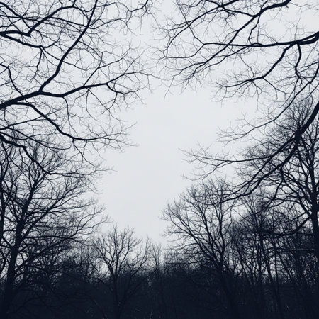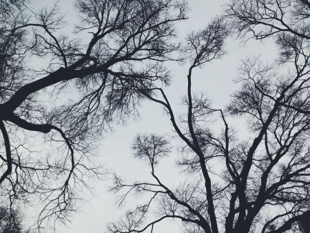 Looking up at trees in a gray sky