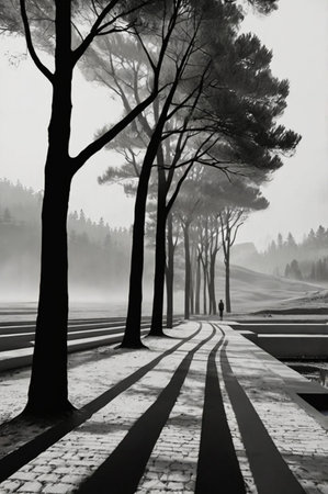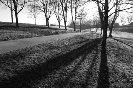 Park in the center of Moscow at sunset, Russia. Black and white photo.