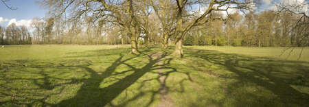Panoramic low wide angle view of a row of old trees with fresh green grass in a scenic public park illuminated in beautiful golden evening light at sunset with lens flare sunlight effect in summer