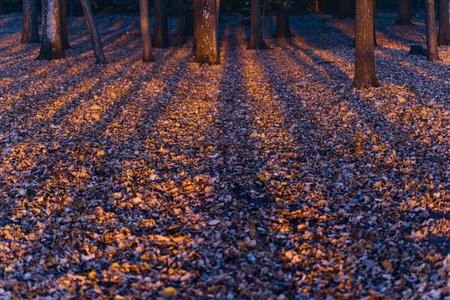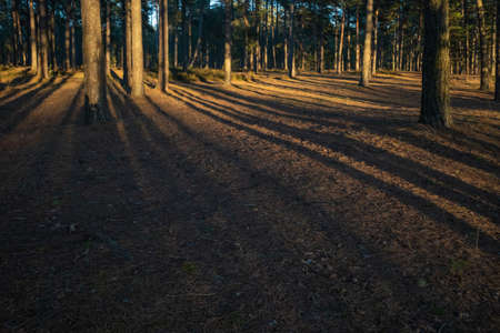 Beautiful sunset light in forrest. Dry falen leaves on foothpath, grass and tree trunks. Pine trees at sunset with long shadows. Text copy space or background.