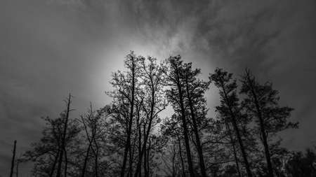 Silhouette of trees in sunset. Trees at sunset. Beautiful spring landscape in Latvia. Beautiful landcape of trees with sunset twilight background. Red orange light on sunset sky over the trees.