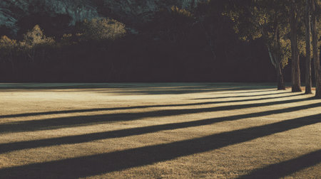 Sunlit park scene with trees, green grass, and long shadows in the afternoon. A serene park scene bathed in the warm glow of the setting sun, featuring lush green grass and tall trees.