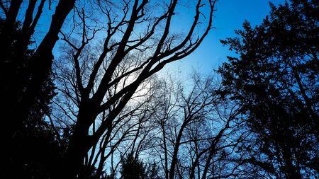 Looking up at tree branches silhouettes, abstract color toned natural background.
