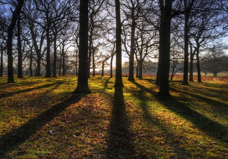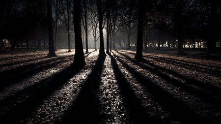Pine tree forest with long shadow cast, back lit woods