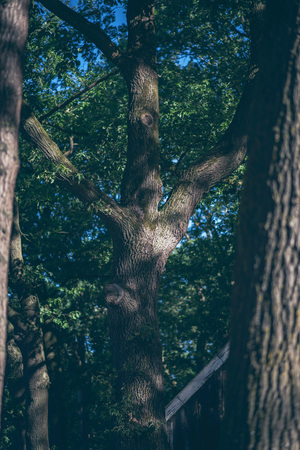 Old forest with moss covered trees and rays of sun in summer - vintage green retro effect