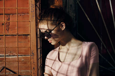 Beauty Asian woman short hair wearing sunglasses and a grey tank top with strips of light and shadows on her face, shadows from the slatted roof.