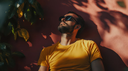 A man relaxes in the sun with sunglasses leaning back against a vibrant wall while surrounded by shadowy leaves capturing a serene moment.