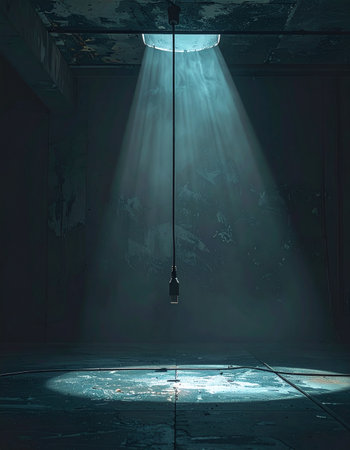 In the deep silence of an abandoned basement, a single bare bulb hangs from a long cord, casting a stark, dramatic spotlight.