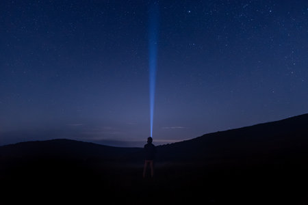 A lone person stands in a serene landscape, using a flashlight to illuminate the dark night sky filled with stars, showcasing the beauty and mystery of our universe.