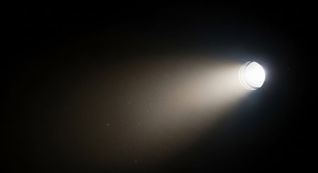 A close-up image of a bright flashlight casting a powerful beam of light into a dark space, highlighting its sleek design and functionality.