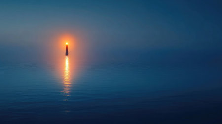 This stunning image captures a solitary lighthouse standing tall in misty waters during dusk. The soft glow of the lighthouse reflects beautifully on the calm ocean surface, creating a serene and tranquil atmosphere. Ideal for themes of navigation, solitude, and coastal beauty.