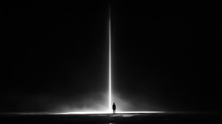A focused beam of light illuminates a path through the darkness on black background, creating a dramatic and visually powerful scene