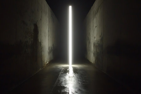 A vertical light strip at the end of a dark tunnel creates strong perspective. Reflections appear on the wet floor with concrete walls. Moody atmosphere, dark and dramatic lighting.