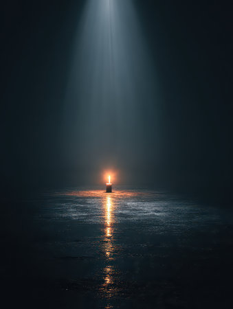 A solitary candle emits a warm glow, surrounded by deep darkness. A soft beam of light streams down, creating a tranquil atmosphere perfect for reflection.