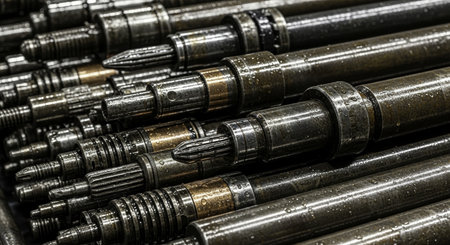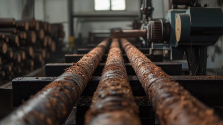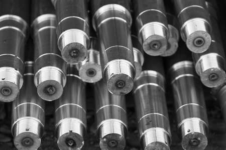 This image showcases a close-up view of industrial metal rods arranged in a dark setting, highlighting their textured surfaces and reflective qualities.
