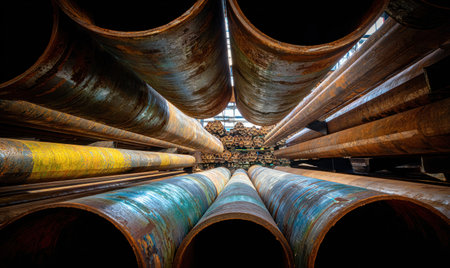 A captivating perspective view of aged and rusty metal pipes arranged in a circular formation, creating an intriguing focal point of light in the center.