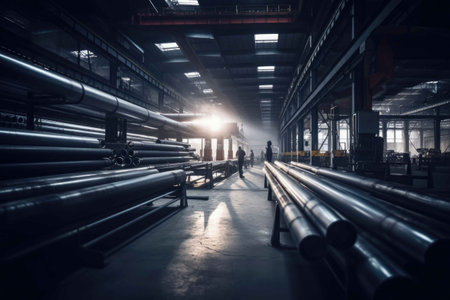 A modern Steel Pipe factory with workers inside. Generative AI