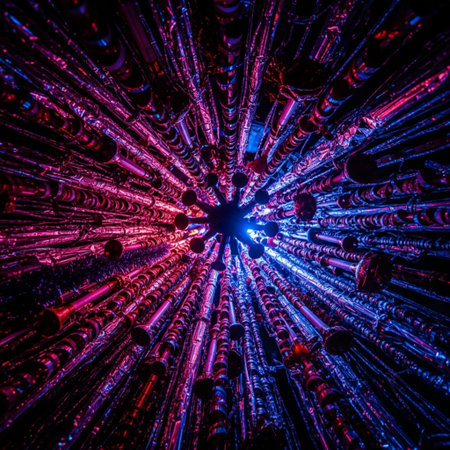 This image presents an abstract composition of circular metal rods illuminated with vibrant blue and orange tones, showcasing intricate textures and industry aesthetics.